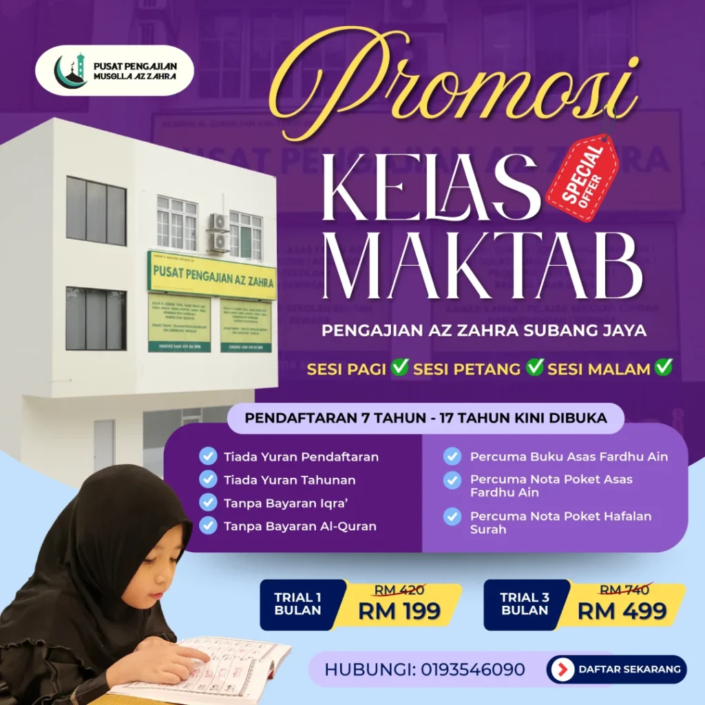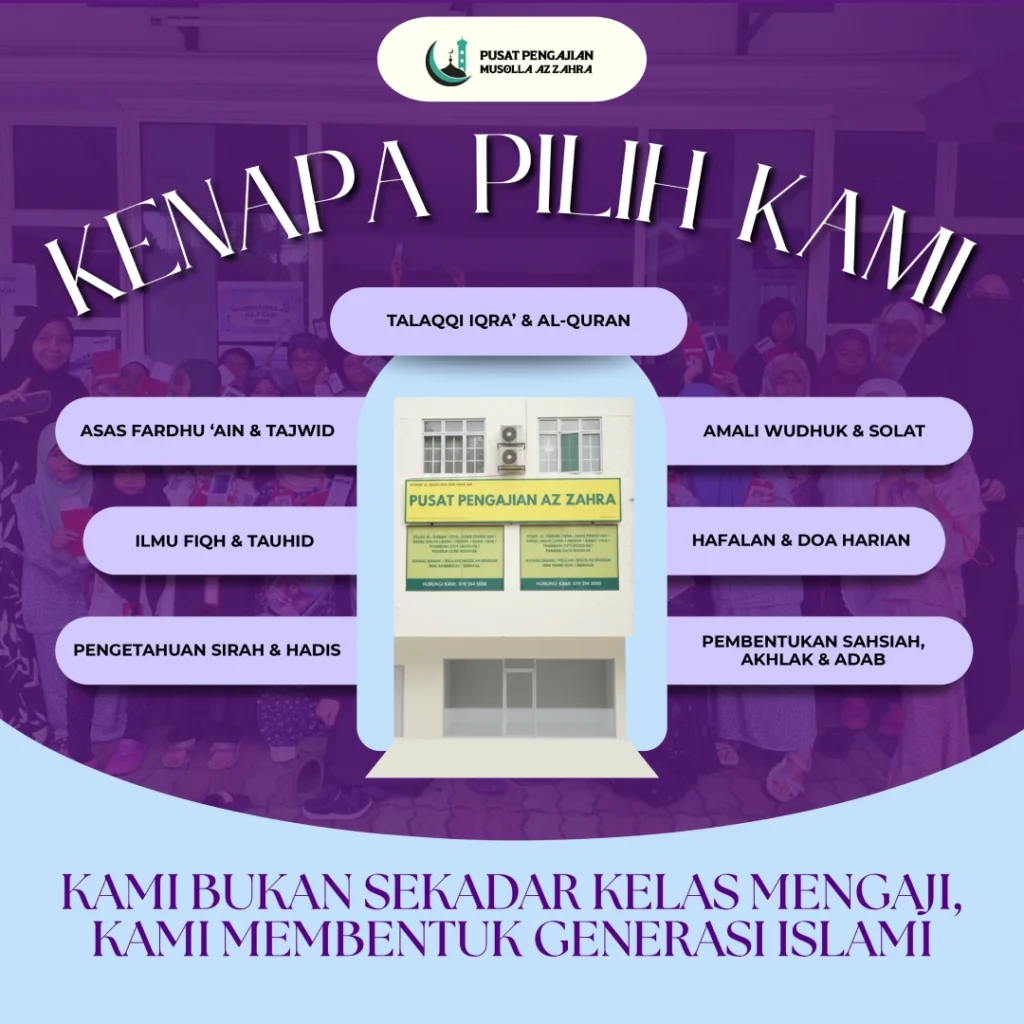 Di Pusat Pengajian Az Zahra, SS15 Subang Jaya, kami membimbing anak secara talaqqi (semak & betulkan bacaan) dari Iqra’ hingga Al-Quran — lengkap dengan asas Fardhu Ain, adab harian serta amali wuduk & solat.